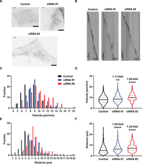 mapre2 loss of function leads to changes in microtubule dynamics. A, Representative still images of microtubule plus-end-tracking experiments in induced pluripotent stem cell derived cardiomyocytes (iPSC-CMs) with MAPRE2 knockdown (KD) using 2 different siRNA vs control siRNA. Scale bars, 10 µm. Please refer to the Supplemental Material for representative videos (Video S1, control; Video S2, siRNA 1; and Video S3, siRNA 2). B, Representative kymographs obtained from the live-cell imaging, which were used for measurement of microtubule parameters. Vertical scale bars, 10 s; horizontal scale bars, 5 µm. Compared with control, MAPRE2 knockdown with siRNAs 1 and 2 resulted in 1.11-fold (P=0.0079) and 1.26-fold (P<0.0001) increases in microtubule growth velocity ( C and D) and in 1.22-fold (P<0.0001) and 1.34-fold (P<0.0001) increases in microtubule growth distance ( E and F), respectively. Dunn multiple comparison tests were used following significant Kruskal-Wallis tests (P<0.0001 for both D and F). Data extracted from 368 control microtubules, 314 siRNA 1 microtubules, and 194 siRNA 2 microtubules, in 5 sets of cells. Representative videos and images were chosen based on closeness to group mean and quality. |