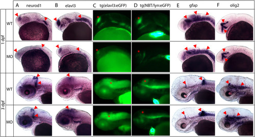 ASS1 deficiency is associated with a specific neuronal differentiation defect. At the 1-cell stage, wildtype or transgenic zebrafish larvae [tg(elavl3:eGFP) or tg(NBT/lyn:eGFP)] were either injected with ASS1-targeting MO or mock and subjected to ISH applying the indicated probes for mRNA detection (A-B, E-F) or in vivo imaging using a binocular fluorescence microscope (Csingle bondD, MZ16F, Leica) at 1 or 3 dpf. Lateral view with anterior to the left (A-F). ASS1-deficient zebrafish larvae exhibited reduced expression of pro-neuronal markers neurod1 and elavl3 at 1 and 3 dpf (A, B). Analogously, MO-injected transgenic zebrafish larvae expressing eGFP under control of the elavl3 promoter showed almost absent eGFP-expression at 1 dpf, which was partially restored at 3 dpf (C). However, ASS1-deficient tg(NBT/lyn:eGFP) transgenic zebrafish exhibited constantly reduced neuronal eGFP expression until 3 dpf as indicator of reduced neuronal cell mass (D). In contrast, glial cell markers gfap (astrocytes) and olig2 (oligodendrocytes) remained unchanged in response to ASS1 deficiency when compared to wildtype control (E, F). Important ISH-staining patterns are marked with arrow head(s) in the wildtype and MO-treated cohort (A, B, E, F). Distinct GFP-expression patterns of the transgenic tg(elavl3:eGFP) (C) or tg(NBT/lyn:eGFP) (D) zebrafish strains are marked with an asterisk in both cohorts.