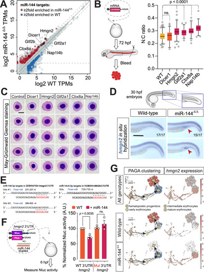 Hmgn2 is a miR-144 target whose expression is downregulated in mature erythrocytes. A Quant-Seq data showing the transcriptomic profile of polyA-containing mRNAs in peripheral blood isolated from 2-dpf zebrafish embryos. Expression units are gene tags per million (TPMs). The average of three biological replicates is plotted. Upregulated (red) and downregulated (blue) miR-144 targets are shown. Genes involved in chromatin organization and transcription are labeled. B Experimental design of testing of candidate genes identified in (A) and quantification of the N:C ratio after May–Grünwald–Giemsa staining (C). Individual cells (n = 142 cells from wild-type, n = 57 from Dicer1, n = 113 from Hmgn2, n = 51 from Gtf2a1, n = 52 from Cbx8a, and n = 50 from Nap1l4b-injected embryos) derived from a pool of bled embryos at 72-hpf are analyzed. Wild-type and Hmgn2-injected data is derived from two independent pools of bled embryos. P values from the one-way ANOVA test with Dunnett’s multiple comparisons test. Boxes enclose data between the 25th and 75th percentile, with a horizontal bar indicating the median. Whiskers enclose 5th to 95th percentiles. Cartoon is adapted with permission from ref. 17. C May–Grünwald–Giemsa staining of peripheral blood cells isolated from wild-type 3-dpf embryos overexpressing different factors. Scale bar indicates 5 µm in length. D Whole-mount in situ hybridization of Hmgn2 mRNA at 30-hpf of miR-144Δ/Δ fish and wild-type siblings. Blue staining indicates the presence of hmgn2 mRNA. Red arrowhead points to the area where hmgn2 mRNA accumulates. Scale bar indicates 200 µm in length. E Predicted miR-144-3p-v1 target sites in hmgn2 3’UTR of Danio rerio and Homo sapiens. miR-144 seed region is indicated in red. F Nanoluciferase reporter assays to validate miR-144 targeting hmgn2 3’UTR. Data represent mean ± standard error of the mean of three technical replicates. P values from two-tailed unpaired t test. Cartoon is adapted with permission from ref. 17. G UMAP plots illustrating the single-cell sequencing results of adult zebrafish pronephros of miR-144Δ/Δ and wild-type zebrafish. Black arrows indicate the path of developmental trajectories inferred with scVelo/PAGA. Only erythroid branch is shown. The plots are colored according to cluster identity (PAGA clustering column) or hmgn2 expression. The expression of hmgn2 is shown as heat map where the color scale represents the natural log of normalized read counts +1 per cell, or ln(cpm+1).