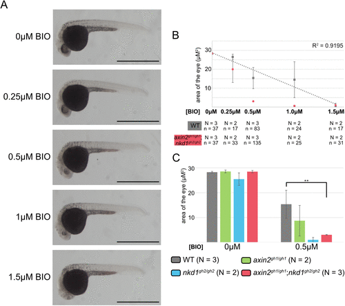axin2gh1/gh1;nkd1gh2/gh2 mutants are sensitive to activation at the destruction complex level. (A) Embryos were treated with varying concentrations of BIO from 4 – 30 hpf with representative images taken of the wild type embryos. (B) In wild type embryos, the area of the eye has a decreasing linear association with the concentration of BIO with all embryos being eyeless at 1.5 µM. In contrast, the majority of the axin2gh1/gh1;nkd1gh2/gh2 mutant embryos were eyeless at 0.5 µM of BIO. (C) The axin2gh1/gh1;nkd1gh2/gh2 mutant has no change in the size of eye in the control treatment but has significantly smaller eyes at 0.5 µM of BIO when compared with wild type revealing that the axin2gh1/gh1;nkd1gh2/gh2 mutants are sensitive to BIO. Measurements were performed on imageJ and a t test was used with ** = p value < 0.01. All error bars represent SEM. No statistics were performed on the axin2gh1/gh1 and nkd1gh2/gh2 single mutants. |