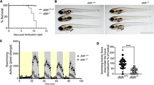 Decreased survival, abnormal gross morphology, and reduced swimming activity in dldh–/– zebrafish larvae. (A) dldh–/– larvae had reduced survival relative to WT larvae, with mortality starting at 8 dpf; n = 300 each strain, across 3 biological replicates; log-rank (Mantel-Cox) test: P < 0.0001; median survival of dldh–/–: 10 dpf. Death was defined by absent heartbeat. (B) Morphological analysis at 7 dpf showed dldh–/– zebrafish larvae had enlarged liver (white arrowhead), darker intestine (black arrows) with universal finding of uninflated swim bladder (asterisk in WT), relative to WT larvae. Scale bar: 0.5 mm. (C) Larval swimming activity (ZebraBox platform and ZebraLab software) tracing showed reduced dldh–/– mutant swimming (open circles) in dark periods (gray) at 7 dpf. Larvae were exposed to 3 consecutive 10-minute 100% light (yellow) and 10-minute dark cycles following a light/dark acclimation period. Each point shows average (mean + SEM) activity of 84 larvae/strain. (D) dldh–/– swimming activity at 7 dpf during dark cycles analyzed by AUC, with group comparison. ****P < 0.0001 by unpaired Student’s t test. Data are shown as mean ± SEM. n = 84 larvae across > 3 biological replicate experiments per strain.