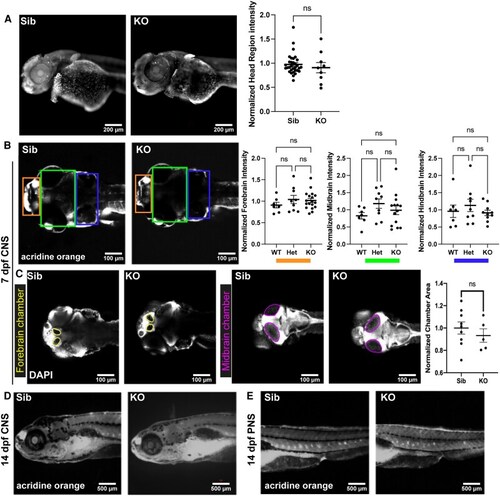 Loss of mtmr5 does not result in excessive cell death in the nervous system and does not cause changes in brain chamber size. (A and B) Representative average Z-projections depicting laterally orientated 2 days post-fertilization (dpf) (A) and 7 dpf (B) zebrafish embryos stained with acridine orange (AO) to visualize and quantify apoptotic cells in live zebrafish brains. No differences in AO intensity were detected between the sibling and the knockout (KO) (A—2 dpf: Sib n = 32, KO n = 9; B—7 dpf: WT n = 7, Het n = 9, KO n = 18). (C) Representative images from fixed and DAPI-stained 7 dpf zebrafish embryos to visualize and quantify brain chamber size. There were no qualitative or quantitative differences in both forebrain and midbrain size between the siblings and KOs at 7 dpf (Sib n = 9, KO n = 5). (D and E) Representative images of AO-stained (D) anterior lateral regions of 14 dpf zebrafish, encompassing the central nervous system, show no visual differences between the siblings and KOs, and (E) posterior-lateral regions of 14 dpf zebrafish, encompassing the peripheral nervous system, show no visual differences between the siblings and KOs. All statistical analyses include at least three independent experiments. Each dot on the graphs represents one zebrafish, at least n = 3 zebrafish were used per group per experiment. Quantitative data are mean±SEM, normalized to the average of WT and presented as ratios. Unpaired two-tailed Student’s t-test was used. ns, not significant. Scale bars: 200 μm (A), 100 μm (B and C) or 500 μm (D).