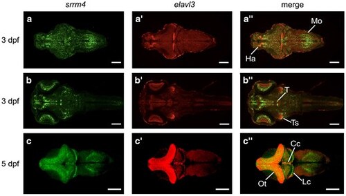 Srrm4 is dynamically expressed at 3 and 5 dpf. a–b″) Single plane images of srrm4 and elavl3 mRNA expression at 3 dpf in 2 focal planes (3 brains averaged). Dorsal views of srrm4 (a, b), elavl3 (a′, b′), and srrm4 and elavl3 merged (a″, b″). c–c″) srrm4 and elavl3 mRNA expression at 5 dpf (5 brains averaged). Dorsal views of srrm4 (c), elavl3 (c′), and srrm4 and elavl3 merged (c″). Areas of overlap, which appear yellow, indicate presumed co-localization. Anterior is to the left. Scale bars = 100 μm. Cc, corpus cerebelli; Ha, habenula; Lc, lobus caudalis; Mo, medulla oblongata; Ot, optic tectum; T, tegmentum; Ts, torus semicircularis.