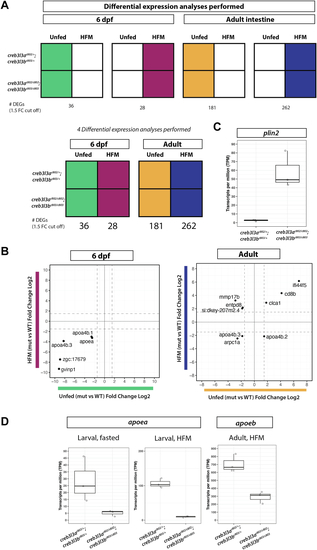 RNA sequencing analysis of creb3l3 mutants at larval and adult stages. A: Visual description of the 4 different analyses performed. Using a cut off of 1.5 for log2 fold change (FC), 6 dpf unfed creb3l3 double mutants have 36 differentially expressed genes (DEGs) compared to double heterozygous siblings (green analysis). After a high-fat meal (HFM), 6 dpf creb3l3 double mutants have 28 DEGs (pink). The number of DEGs significantly increases in adult animals. In the unfed state, creb3l3 double mutant adults have 181 DEGs (orange), and after an HFM, creb3l3 adults had 262 DEGs compared to double heterozygous siblings (blue analysis). B: The lists of DEGs between each feeding condition were compared for each age group and cross plotted (green versus pink and orange versus blue). In 6 dpf animals, apoa4b.1, apoa4b.3, apoea, zgc:17,679, and gvinp1 were genes that were downregulated in creb3l3 mutants in both feeding conditions. In adult animals, clca1, cd8b, and ifi44f5 are upregulated in creb3l3 mutants in both unfed and fed conditions. apoa4b.2 is upregulated in unfed, adult creb3l3 mutants, but downregulated after a HFM. mmp17b, entpd8, and si:dkey-207m2.4 are upregulated in creb3l3 mutants after a HFM but downregulated in unfed creb3l3 mutants. apoa4b.3 and arpc1a are downregulated in creb3l3 mutant adults regardless of feeding. C: plin2 expression fasted creb3l3 adults. D: Expression of apoea and apoeb is downregulated in larval and adult creb3l3 mutants. Creb3l3, cAMP-responsive element-binding protein 3–like 3; dpf, days post fertilization; Plin, perilipin.