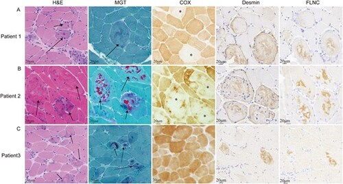 (A) Pathological biopsy and immunohistochemical staining results for patient 1. HE staining of patient 1 revealed mild variation in muscle fibre size, with basophilic material (indicated by arrows). Spherical bodies were observed via MGT staining (indicated by arrows), alongside COX-negative muscle fibres (indicated by *). (B) Pathological biopsy and immunohistochemical staining results for patient 2. Acidophilic material was evident on HE staining (indicated by arrows), cytoplasmic bodies on MGT staining (indicated by arrows), and large irregular areas of COX activity loss were noted within muscle fibres. (C) Pathological biopsy and immunohistochemical staining results for patient 3. HE staining revealed acidophilic material (indicated by arrows), cytoplasmic bodies on MGT staining (indicated by arrows), and no COX enzyme deficiency. Immunohistochemical staining revealed the deposition of desmin and filamin-C in all three patients. |