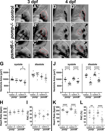 Cardiac function deficits are observed by 4 dpf in pomp and psmd6 mutants. A.-F. Brightfield views of hearts taken from videos of 3 dpf and 4 dpf larvae. A’-F’ panels show ventricles outlined in red. Arrowheads in E’ and F’ point to edema. Scale bars = 100 μm. G.-I. Graphs showing ventricular area, heart rate, and ventricular fractional area change (FAC) measurements at 3 dpf. Each dot represents the average of 3 measurements from a single heart/larva. Bars represent mean +/- SEM. Animals were genotyped after video recordings. N = 13 for pomp control (+/+). N = 7 for psmd6 control (+/+). N = 7 for pomp-/-. N = 8 for psmd6-/-. * P < 0.05. J.-L. Graphs showing ventricular area, heart rate, and ventricular FAC measurements at 4 dpf. Each dot represents the average of 3 measurements from a single heart/larva. Bars represent mean +/- SEM. Animals were genotyped after video recordings. N = 12 for all conditions: pomp control (+/+ and +/-), psmd6 control (+/+ and +/-), pomp-/-, and psmd6-/-. ** P < 0.01; **** P < 0.0001.