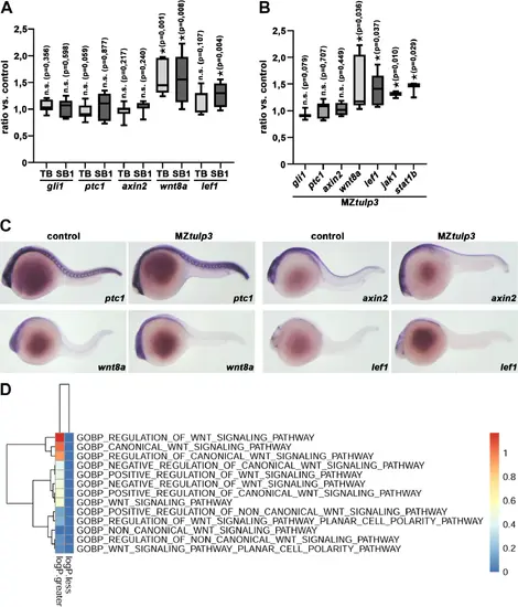 Tulp3 deficiency results in the upregulation of cilia-dependent signalling pathway components in zebrafish. (A) qPCR analysis reveals unaltered expression of Hh signalling components (gli1, ptc1) and Wnt signalling component axin2 while Wnt signalling components wnt8a and lef1 were upregulated upon TB/SB1-MO tulp3 mediated knockdown compared to the respective control at 1dpf. (B) qPCR analysis reveals unaltered expression of Hh signalling components (gli1, ptc1) and Wnt signalling component axin2 while Wnt signalling components wnt8a and lef1 or Jak/Stat signalling components jak1 and stat1b were upregulated in MZtulp3 embryos compared to the respective control at 1dpf. (C) WISH analyses indicate unaltered expression of Hh signalling component ptc1 and Wnt signalling component axin2 while Wnt signalling components wnt8a and lef1 were upregulated in MZtulp3 embryos compared to the respective control at 1dpf. (D) Heatmap of Wnt signalling pathway associated gene ontology (GO)-terms (biological process, BP) of MZtulp3 embryos compared to control embryos at 2dpf. Columns represent up- or downregulated processes in MZtulp3 mutant embryos compared to controls.