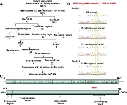 A-B Whole exome sequencing and Sanger sequencing revealed a novel PHEX variant (NM_000444, c.1763 A > T, N588I) identified in members with NSTA. C Location of the identified variant (marked in red) in schematic diagram of PHEX |