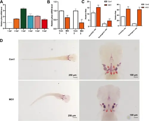 A Phex expression at different stages post-fertilization in zebrafish (n = 20 embryos per time point, 3 independent experiments). B Validation of Phex expression inhibition efficiency (n = 15 embryos per group, 3 independent experiments). C Statistics depicting mortality and malformation rates at varying concentrations of MO (n = 120 embryos total, pooled from 3 independent experiments with n = 40 per experiment). D Microinjection of zebrafish eggs and observation of tooth development at 6 days post-fertilization (dpf) via Alizarin Red staining (n = 30 embryos per group, 3 independent experiments). Scale bars: 250 μm (embryo images), 100 μm (tooth staining images). Data represent mean ± SEM. Statistical analysis performed using Student’s t-test for pairwise comparisons and one-way ANOVA for multiple group comparisons. *p < 0.05, **p < 0.01, ***p < 0.001 vs. control group