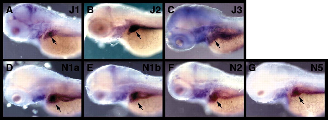 Fig. 5 Liver expression of zebrafish jagged and notch genes. (A-C) Lateral view of wild-type 72-hpf larvae processed for RNA in situ hybridization using jagged 1 (A), jagged 2 (B) and jagged 3 (C) antisense probes. All three jagged genes are expressed in the larval liver (arrow), but jagged 2 expression is most pronounced. Expression in the branchial arches is also evident. (D-G) Lateral view of wild-type 72-hpf larvae processed for RNA in situ hybridization using notch 1a (D), notch 1b (E), notch 2 (F) and notch 5 (G) probes. All notch genes are expressed in the developing larval liver and the branchial arches.
