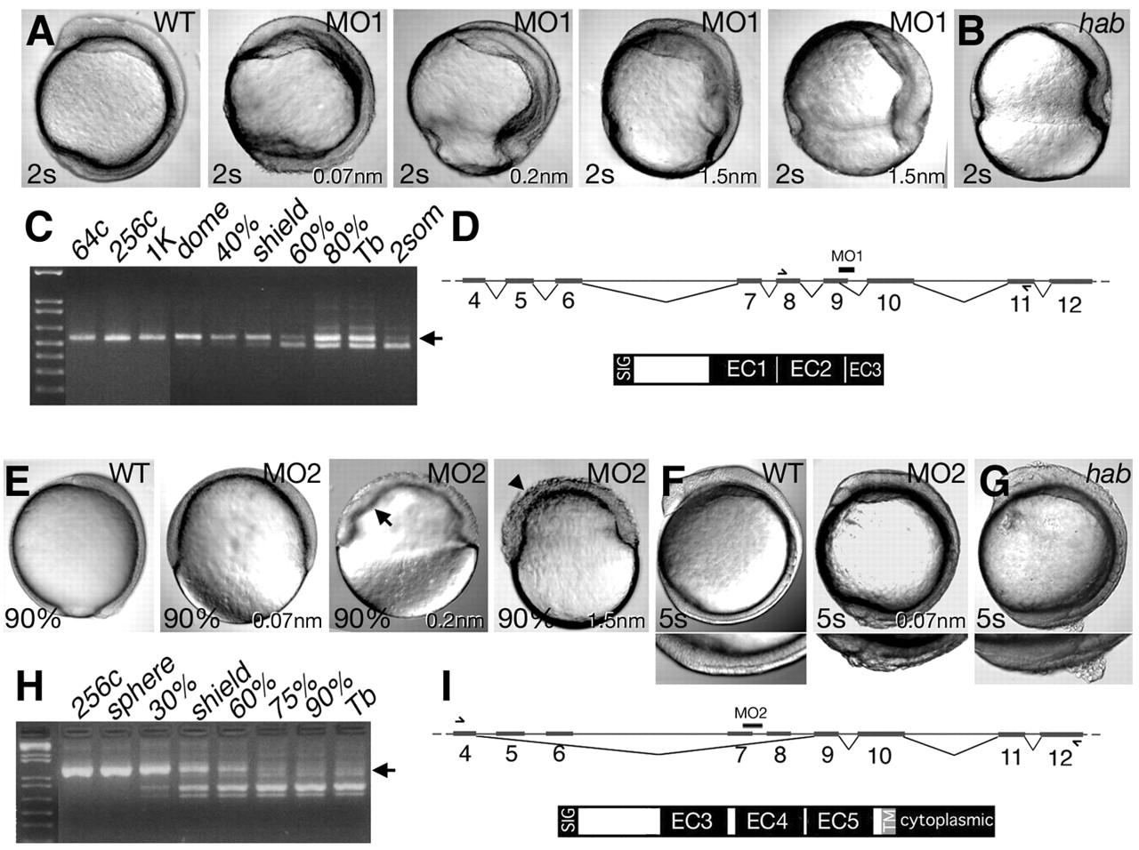 Fig. 3 Phenocopies of hab allele-specific traits by disruption of EC1 or EC4. (A) Injection of morpholino oligonucleotide MO1 into wild-type embryos at increasing doses mimics the epiboly arrest phenotype. (B) Phenotype of habdtv43/dtv43 at equivalent stage. (C) Aberrant splice products caused by MO1 appear at doming, shortly after the beginning of zygotic transcription (Kane and Kimmel, 1993). Arrow indicates maternal product. (D) Splicing event caused by MO1 (black bar) and conceptual protein, inferred by sequencing RT-PCR product using the primers indicated by arrows in exon8 and exon11. (E) Injection of MO2 into wild-type embryos at increasing doses causes a severe epiboly arrest, uneven radial intercalation (arrow) and dissociation of the blastoderm (arrowhead). (F) Injection of MO2 into wild-type embryos at low doses mimics the ZMD trait. Embryos are shown at the 5-somite stage and the detached cell region is shown beneath at higher magnification. (G) Phenotype of ZMD habtm94/+. (H) Splice products caused by MO2. (I) Splicing event caused by MO2 and the conceptual protein, as inferred by sequencing the RT-PCR product using the primers indicated in exon4 and exon 12.