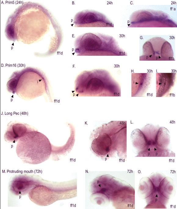 Fig. 4 Developmental expression of ff1d detected by whole-mount in situ hybridization. A,B: Detection of ff1d in the pituitary of 24 hr embryos. C: Detection of ff1a in the pituitary of 24 hr embryos. D-F: Detection of ff1d in the pituitary of 30 hr embryos. G: Detection of ff1b in the pituitary of 30 hr embryos. H,I: Detection of ff1d and ff1b in the interrenal of 30 hr embryos. J-L: Detection of ff1d in the pituitary of 48 hr embryos. M-O: Detection of ff1d in the pituitary of 72 hr embryos. p, pituitary; i, interrenal.