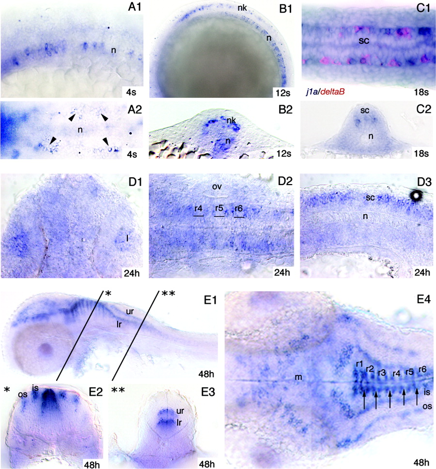 Fig. 2 jagged1a expression pattern. in situ hybridization of embryos at different developmental stages performed with the jagged1a probe. A: At the four-somite stage (4s), jagged1a is expressed in the notochord (A1) and in scattered cells (arrowheads) in the intermediate neural plate (A2). B: At the 12-somite stage (B1, B2) jagged1a is expressed in the notochord and in cells located in the intermediate neural keel. C: At the 18-somite stage (C1, C2) the notochord is no longer labeled, while in the spinal cord jagged1a is expressed in cells located in a mediolateral position where some cells expressing deltaB are also observed (C1). D: At 24 hpf jagged1a is expressed in the lens (D1), the rhombomere borders (D2), and the spinal cord (D3). E: At 48 hpf in the central nervous system (E1-E4), jagged1a-expressing cells occur in the midbrain, hindbrain, and spinal cord. In the hindbrain (E1, E2, E4), the labeled cells are located dorsally at the anterior and posterior rhombomere borders and in bilateral inner and outer strings of cell clusters. In the caudal hindbrain and spinal cord (E1 and E3), the jagged1a-expressing cells are situated medially in bilateral upper and lower stripes. In D2 and E4, the position of the rhombomeres has been determined on the basis of the location of the otic vesicles. The arrows in E4 indicate the boundaries between the rhombomeres. Views are lateral (A1, B1, D3, E1) or dorsal (A2, C1, D1, D2, E4); transverse sections are the level of the trunk (B2, C2), the rhombomeres (E2), and caudal hindbrain (E3). Anterior is to the left in all lateral and dorsal views except for D1, in which it is to the top. is, inner string of jagged1a-expressing cell clusters; l, lens; lr, lower row of jagged1a-expressing cells; m, midbrain; n, notochord; nk, neural keel; os, outer string of jagged1a-expressing cell clusters; ov, otic vesicle; r1 to r6, rhombomeres 1 to 6; sc, spinal cord; ur, upper row of jagged1a-expressing cells.