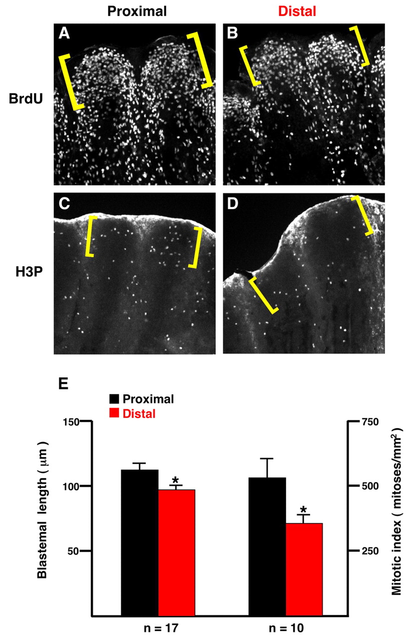 Fig. 2 Blastemal length and mitotic index depend on PD position. (A,B) Proximal and distal 3 dpa regenerates (33°C) of the same fin stained for BrdU incorporation (fins collected 30 minutes post-injection). The proximal regenerate has a greater PD length of especially BrdU-dense blastemal mesenchyme (brackets). (C,D) Proximal and distal 3 dpa regenerates of the same fin stained for phosphorylated Histone-3 (H3P), an indicator of mitosis. Fine points indicate individual mesenchymal mitotic nuclei. This particular fin was chosen because even though it has similar blastemal sizes for the proximal and distal regenerates (brackets; actual BrdU stain is not shown), there are clearly more H3P-positive cells in the proximal blastema. As reported previously, fins show non-specific epidermal fluorescence at the distal edge of the regenerate (Poss et al., 2002b). (E) Quantification of blastemal length and mitotic index at 3 dpa (*P<0.05, t-test).