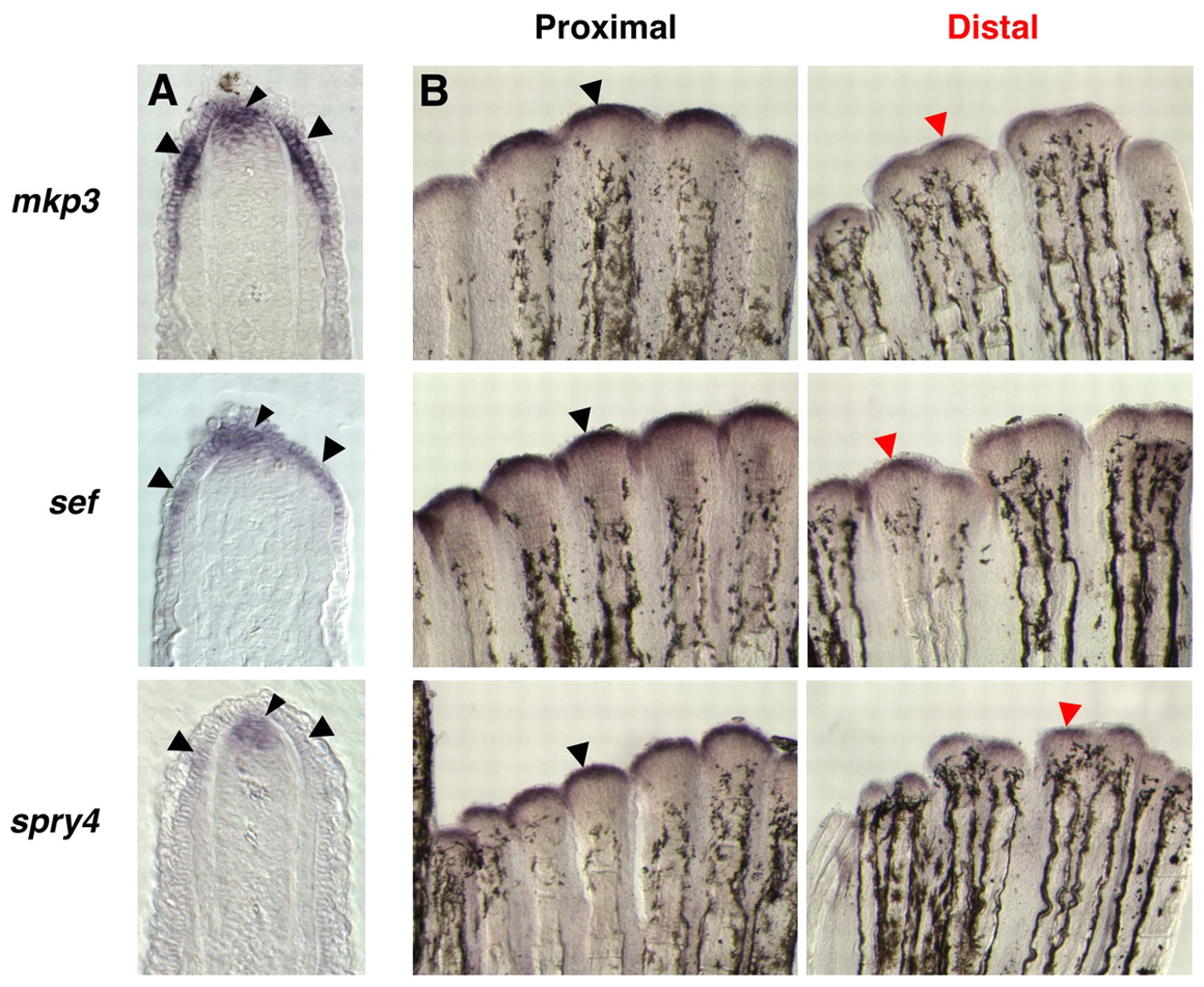 Fig. 3 Amputation level controls the amount of Fgf target gene expression during regeneration. In situ hybridization analysis of Fgf target gene expression in 3 dpa double-amputated fins (33°C). (A) A representative section from a single-amputated fin demonstrates expression for mkp3, sef and spry4 in both the basal epidermal layer and the distal region of the blastema (arrowheads indicate in situ hybridization signals). (B) Whole-mount images for each gene show proximal and distal regenerates of the same double-amputated fin. mkp3 (15 out of 24 regenerates), sef (8 out of 11 regenerates) and spry4 (12 out of 18 regenerates) were usually expressed more strongly in proximal regenerates than distal. We never detected greater expression of these genes in distal regenerates.