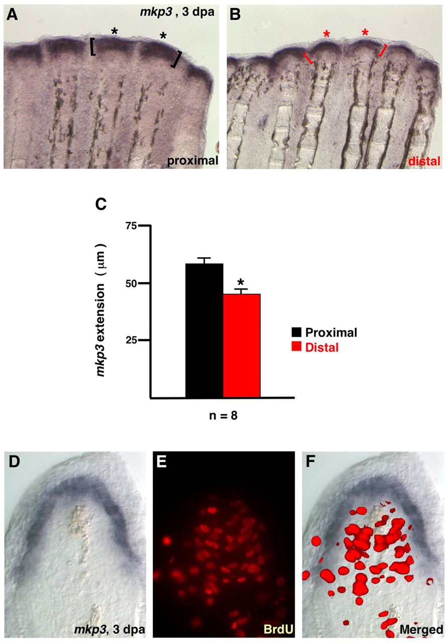 Fig. 4 Position-dependent length of Fgf target gene expression domains. (A,B) Images from the same double-amputated fin regenerate demonstrates a longer PD length of mkp3 expression (asterisks, brackets) in proximal regenerates. (C) The length of the proximal signal was 28% longer than the distal signal on average (n=8; *P<0.005, t-test). (D-F) 3 dpa fin regenerate (33°C) stained for mkp3 expression (D) and BrdU incorporation (E). Cells in the distal blastema and basal epidermal layers expressing mkp3 show little proliferation. However, proliferative blastemal mesenchyme is bordered by epidermal mkp3 expression/Fgf signaling (F).