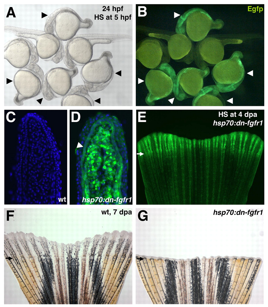 Fig. 5 Transgenic fish that facilitate inducible expression of a dominant-negative Fgfr1 construct. (A,B) hsp70:dn-fgfr1 transgenic and wild-type embryos were raised until sphere stage at 28°C, shifted to 37°C for 1 hour, and returned to 28°C until 28 hpf. Transgenic embryos are truncated and display Egfp fluorescence (arrowheads). (C,D) Section through a wild-type (C) or hsp70:dn-fgfr1 (D) 4 dpa fin regenerate 5 hours after heat induction. Strong Egfp fluorescence is observed in all cells of the transgenic regenerate, including the fgfr1/mkp3/sef/spry4-positive basal epidermal layer (arrowhead). Nuclei are stained with DAPI (blue). (E) Whole-mount image of fin shown in D, demonstrating Egfp fluorescence throughout the fin. The regenerate shows stronger fluorescence than the non-regenerating portion at 4 dpa. This is probably due in part to the scarceness of pigment cells and differentiated bone in the newly formed tissue that might impede fluorescence detection. (F,G) Adult fin regeneration is blocked by daily heat-induction of dn-fgfr1 at 38°C. Wild-type (F) and hsp70:dn-fgfr1 (G) fins are shown at 7 dpa.
