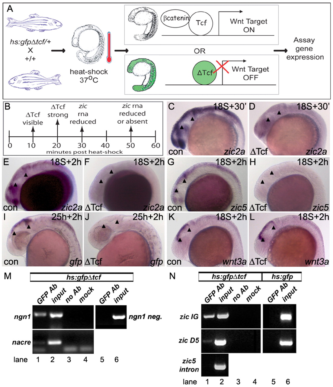 Fig. 4 Tcf/Lefs are required for zic gene expression. (A) The method used to disrupt Tcf/Lef signaling at controlled times. (B) Temporal correlation between GfpΔTcf induction (by fluorescence) and zic2a RNA (by ISH). (C-L) Representative embryos after ISH. Stage of heat-shock and recovery time are indicated at upper right. Zic2a expression is normal in ΔTcf-negative heat-shocked controls (C,E), and reduced or absent in ΔTcf-positive siblings (D,F). Zic5 expression was normal in ΔTcf-negative (G) embryos, and absent in ΔTcf-positive embryos (H). Zic2aD5:gfp expression was normal in ΔTcf-negative embryos (I) and absent in ΔTcf-positive embryos (J). Wnt3a expression was normal in heat-shocked controls (K) and in ΔTcf-positive siblings (L). All views are lateral, anterior to the left. Arrowheads mark anterior and posterior tectal borders. (M,N) Gfp ChIP analysis of heat-shocked Tg(hs:gfpΔtcf) and Tg(hs:gfp) embryos. Genotype of embryos and PCR templates are shown above, as follows: GFP Ab, chromatin after anti-Gfp IP; input, total chromatin before IP; no Ab, no-antibody ChIP; mock, no chromatin. Regions amplified are labeled next to the corresponding bands. (M) Promoters of known Wnt targets, ngn1 and nacre. An upstream region of ngn1, lacking functional Tcf/Lef-binding sites (lane 5). (N) IG and D5 regions of zic2a-zic5 and zic5 intron.