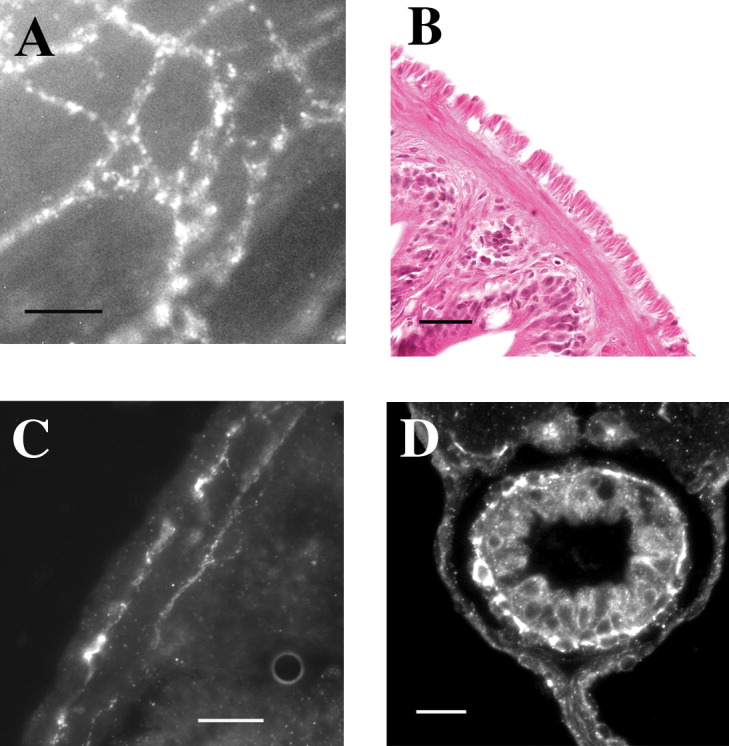Fig. 2 Cells with Kit-like immunoreactivity form a dense network in the myenteric plexus region, and a second network close to the circular smooth muscle-submucosal border. High magnification of Kit-positive cells reveals individual stellate-shaped cells (white) in a full thickness stack (A). Circular and longitudinal muscle layers of the adult GI tract are clearly observed in H&E stained transverse sections (B). Kit-positive cells are found in the myenteric plexus region, and a thin layer of Kit-positive cells is located near the circular smooth muscle-submucosal border (C). A single layer of Kit-positive cells was observed in the tunica muscularis of transverse sections of zebrafish larvae (white arrow) (D). Scale bars = 20 μm.