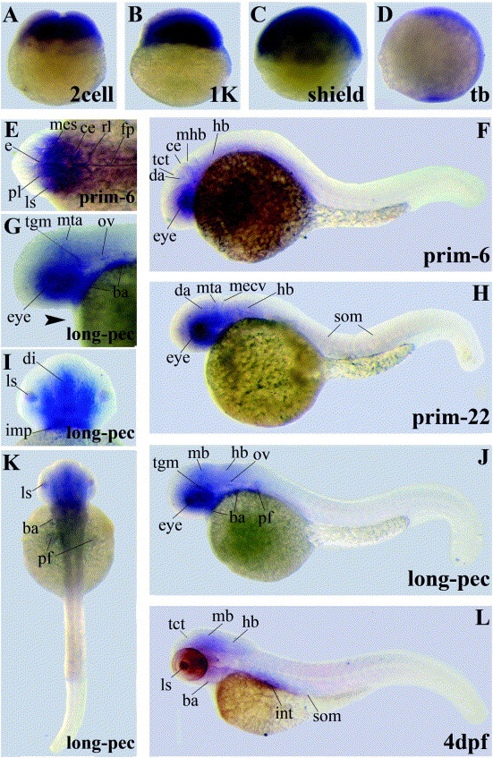 Fig. 2 Gene expression patterns of LIMK1 variants encoding the PDZ domain. Abbreviations used are: branchial arches (ba), cerebellum (ce), diencephalon (di), dorsal aorta (da), epithalamus (e), floorplate (fp), hindbrain (hb), intermandibularis posterior (imp), intestine (int), lens (ls), midbrain (mb), midcerebral vein (mecv), mesencephalon (mes), midbrain–hindbrain-boundary (mhb), metencephalic artery (mta), otic vesicle (ov), pectoral fin buds (pf), proliferative cell layer (pl), rhombencephalon (rl), somites (som), tectum (tct), tegmentum (tgm).