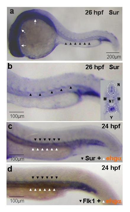 Fig. 1 Whole-mount in-situ hybridization showing the expression of survivin in zebrafish embryos. (a, b): Survivin is expressed diffusely in the developing central nervous system (white arrows) and the axial vasculature (arrowheads) at 26 hpf. Similar expression patterns were seen at 56 hpf (not shown). (b, insert): Coronal section of stained embryos at 26 hpf showing preferential expression of survivin at the vicinity of the dorsal aorta and the developing neural tube (circled). (c, d): Double in-situ hybridization showing remarkably similar expression pattern of survivin (c) and flk1 (d) (blue, dark arrowheads) in relation to that of embryonic hemoglobin-α (brown, white arrowheads). Pictures are representative of at least three separate experiments. NT: Neural Tube; M: Myotome; N: Notochord; Y: Yolk sac extension.