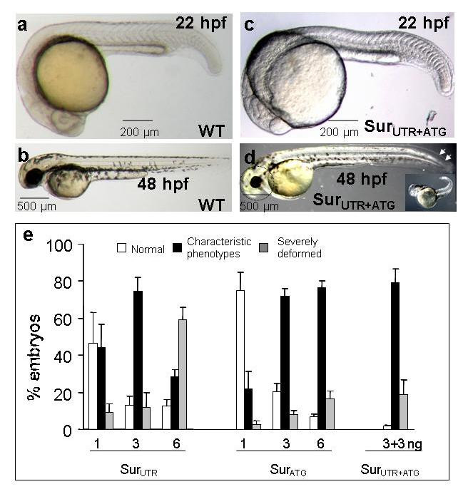 Fig. 2 Effects of survivin knock-down on embryonic development. (a, b): Wild-type (WT) embryos injected with random sequence morpholino at 22 hpf (a) and 48 hpf (b). (c, d): Embryos injected with a combination of SurATG (3 ng) and SurUTR morpholinos (3 ng) (SurATG+UTR) at 1–4 cell stage. Noted that while there was no significant morphological changes at 22 hpf, most of the embryos injected with SurATG+UTR morpholinos at 48 hpf showed a "characteristic phenotype" with reduced head and eye size (circled) and a mildly curved tail (arrowheads). Similar phenotypes were also seen in embryos injected with either SurATG or SurUTR morpholinos at various doses but not in WT embryos injected with random sequence. Insert (d) showed a severe phenotype at 48 hpf characterized by severely deformed embryos which did not survive beyond 48 hpf. These embryos were not included in the analysis. Each picture is representative of at least three experiments. (e): The dose-dependence of either SurATG, SurUTR or SurATG+UTR morpholinos. Optimal response was observed when embryos were co-injected with 3 ng of each MO (SurUTR+ATG). Results were expressed as mean ± S.E.M. In each experiment, MOs at different doses were injected into the same batch of embryos and were scored at the same time. More than 40 embryos have been injected at each dosage.