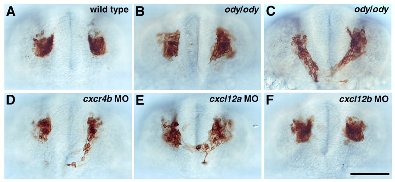 Fig. 3 Cxcl12a/Cxcr4b signaling is required for olfactory neuron positioning. Wild-type zebrafish embryos (A), ody mutants (B,C), cxcr4b MO-injected embryos (morphants) (D), cxcl12a morphants (E) and cxcl12b morphants (F), which all carry the omp:yfp transgene, were stained with anti-GFP antibody at 24 hpf to visualize olfactory neurons. All panels show frontal views with ventral to the bottom. Two representative ody/ody embryos with mild (B) and severe (C) defects in olfactory neuron positioning are shown. Scale bar: 100 μm.