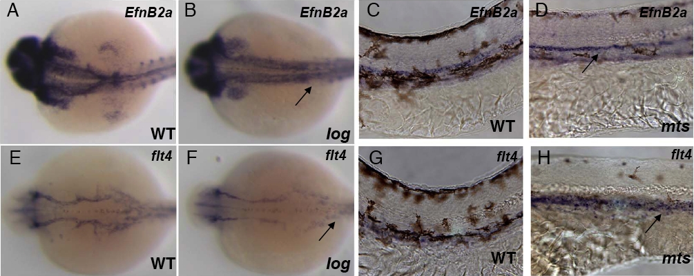 Fig. S2 Endothelial fate specification appears unaffected in mutants with defective lumen formation. (A–H) In situ hybridization with the arterial specific marker ephrinB2a (A to D) and the venous specific marker flt4 (E to H) in 36 hpf logs231 mutant embryos (B and F) and wild-type siblings (A and E), and in 36 hpf mtss233 mutant embryos (D and H) and wild-type siblings (C and G). Black arrows point to the vascular expression of ephrinB2a and flt4. Although these mutants display defective vascular lumen formation, the specification of endothelial cells appears relatively unaffected.