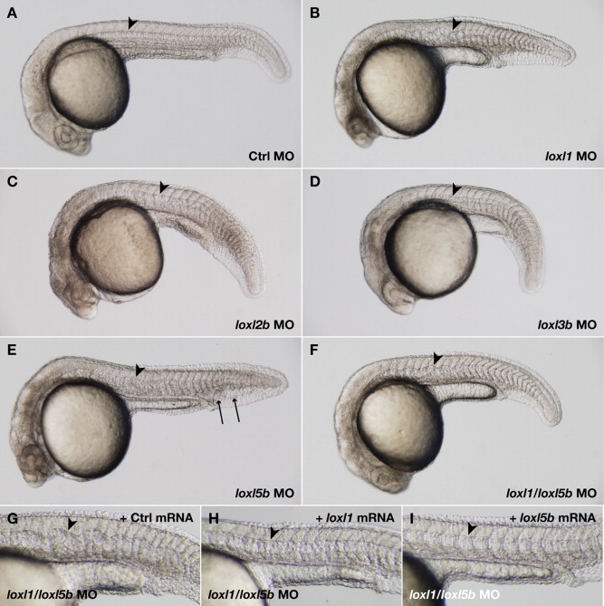 Fig. 5 Morpholino knockdown of loxl1 or loxl1 and loxl5b together results in notochord distortion. Wild-type embryos were injected with morpholinos (MO) to notochord-expressed lysyl oxidases and photographed at 24 hpf. (A) 12 ng standard control; (B) 6 ng loxl1; (C) 3.7 ng loxl2b; (D) 12 ng loxl3b; (E) 7.4 ng loxl5b; (F) 2.4 ng loxl1 and 5 ng loxl5b. The notochord (arrowheads) is strikingly distorted after knockdown of loxl1 (B), and caudal vein edema develops with the loxl5b morpholino (E, arrows). Combining doses of loxl1 and loxl5b morpholino that do not cause notochord distortion alone also recapitulates the notochord phenotype seen with neocuproine and β-aminopropionitrile treatment (F). This distortion is specifically rescued by co-injection of mRNA encoding either loxl1 (H) or loxl5b (I), but not control sequence (G).