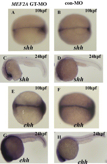 Fig. 4 MEF2A is not required for shh and ehh transcription. (A, B, E and F) (A, n = 20 embryos; B, n = 20 embryos; E, n = 20 embryos; F, n = 18 embryos) Dorsal views of whole-mount embryos at the bud stage (10 hpf). (C, D, G and H) (A, n = 20 embryos; B, n = 22 embryos; E, n = 20 embryos; F, n = 20 embryos) Lateral views of whole-mount embryos with the head to the left at 24 hpf. Expression in MEF2A morphants of both shh (A and C) and ehh (E and G) is similar to that observed in control embryos (B, D, F and H).