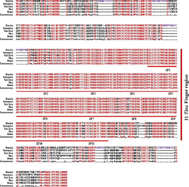 Fig. 2 Multiple alignment of CTCF proteins. The amino acid sequences of zebrafish (Danio; GenBank accession No. AY547282), chicken (Gallus; GenBank accession no. Z22605), human (Homo; GenBank accession no. HSU25435), mouse (Mus; GenBank accession no. U51037) and Xenopus (Xenopus; GenBank accession no. AF305695) CTCF were aligned using the MultAlin computer program (http://prodes.toulouse.inra.fr/multalin/multalin.html). Identical amino acids are marked in red. Dashes indicate absence of alignment. The unique zebrafish amino acid regions are marked in purple.