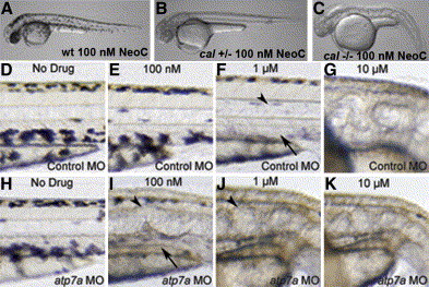 D–K) Embryos injected with control MO (D–G) display a phenotypic dose-response curve in neocuproine of the notochord (arrowheads) and melanin pigment (arrows) that is altered in embryos injected with atp7a-targeted MO (H–K). All embryos were treated continuously from 3 hpf with the indicated dose of drug.