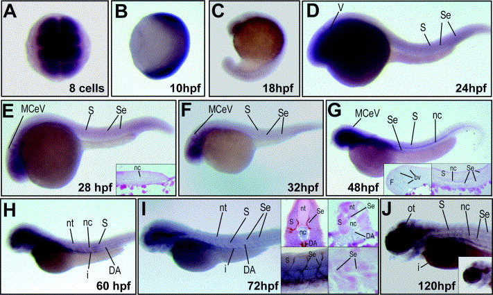 Fig. 3 Expression of hif-2α in zebrafish embryos and larvae as revealed by mRNA in situ hybridization. hif-2α mRNA is maternally expressed and ubiquitously distributed at early stages (A and B), becoming ventrally restricted later in embryogenesis (C); (A) dorsal view; (B) and (C), lateral views with the anterior side on top. At 24 (D), 28 (E) and 32 hpf (F) hif-2α was detected in the brain, somites, and blood vessels. At 48 hpf, hif-2α expression is present in brain blood vessels, notochord and intersegmental blood vessels (G), as it is shown in the brain (left inset in G) and tail paraffin cross-sections (right inset in G). At 60 hpf, hif-2α mRNA is expressed in the brain, somites, dorsal aorta, intestine and notochord (H). At 72 hpf, hif-2α expression was detected in the brain, brain blood vessels, intersegmental vessels, dorsal aorta and intestine (I). mRNA in situ hybridization for hif-2α and anti-GFP immunohistochemistry in Tg(fli1:EGFP)y1 embryos show that expression occurs in intersegmental blood vessels (left-top inset in I, transverse cross-section; left-bottom inset, DIC lateral view). Paraffin cross-sections of wild type embryos at 72 hpf, show expression of hif-2α in somites, intersegmental blood vessels, notochord and aorta (right-top inset in I, transverse cross-section; right-bottom in I, sagittal cross-section). At 120 hpf, expression of hif-2α was detected in the optic tectum, intersegmental blood vessels, notochord, intestine and retina (J). (D)–(J) are lateral views with anterior to the left. Insets show transverse cross-sections with the dorsal part on the top, or sagittal cross-sections with anterior to the left. Abbreviations: V, ventricle epithelia; F, forebrain; M, midbrain; H, hindbrain; MCeV, middle cerebral vein; Se, intersegmental vessel; DA, dorsal aorta; nc, notochord; S, somites; nt, neural tube; I, intestine; bv, blood vessel; nm, neuromasts; ot, optic tectum; e, eye; r, retina.