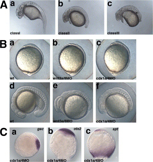 Fig. 4 Cooperation of Cdx1a and Cdx4 in formation of the posterior body. (A) Phenotypes of cdx1aMO and/or cdx4MO-injected pharyngula-stage (24 hpf) embryos. The phenotypes were classified into three categories. In Class I embryos, the tail was extended but its size was reduced, and the number of somites was not changed (30–34 somites). Class II embryos had a truncated tail structure (number of the somites 20–30, average 25.2 (n = 10)). Class III embryos had no evident structure protruding from the yolk (no tail structure; less than twenty somites, average 10.3 (n = 12)). The percentage of embryos in each class is shown in Table 2. (B) Comparison between the wnt3a/wnt8 and cdx1a/cdx4 morphant embryos. The phenotypes of wild-type (non-injected) control embryos (wt, a, d), embryos receiving an injection of 4.2 ng of wnt3aMO and wnt8MOs (wnt3a/8MO, b, e), and embryos receiving an injection of 2.1 ng of cdx1aMO and cdx4MO (cdx1a/4MO, cdx1a/cdx4 morphant embryos, c, f), at the bud stage (a–c, lateral views with dorsal to the right) and 17 hpf (d–f, lateral views, with anterior to the left). Neither the wnt3a/wnt8 nor the cdx1a/cdx4 morphant embryos showed strong morphological abnormalities at the bud stage. At 17 hpf (17-somite stage for the wild-type), both the wnt3a/wnt8 and cdx1a/cdx4 morphant embryos displayed a truncated tail, whereas only the wnt3a/wnt8 morphant embryos had an enlarged head and eyes. (C) Expression of goosecoid (gsc) (a) at the shield stage, and otx2 (b) and spadetail (spt) (c) at the 90% epiboly stages in the cdx1a/cdx4 morphant embryos. Expression of these genes was not significantly affected in the cdx1a/cdx4 morphant embryos, compared with the wild-type embryos (Fig. 1). a, animal pole view with dorsal to the right. b, c lateral views with dorsal to the right.