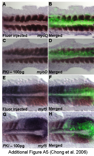 Fig. S5 Control experiments for in vivo effects of PKI on the induction of myogenic transcription. (A,B) Fluorescent-dextran injected embryos stained with myoD (n = 10), 14 h. (C,D) PKI injected embryos with robust myoD (n = 10), 14 h. (E,F) Fluorescent-dextran injected embryos stained with myf5 (n = 10), 14 h. (G,H) PKI injected embryos with augmented myf5 (n = 10), 14 h.