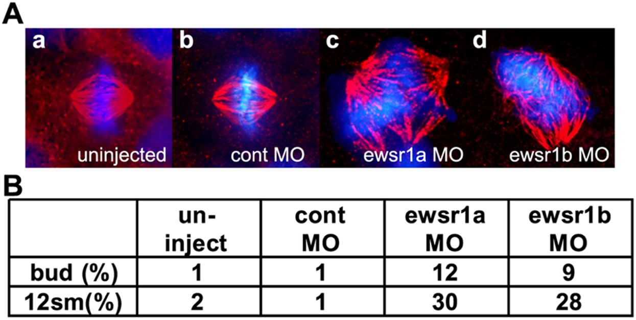 Fig. 7 ewsr1 MO Injected Zebrafish Embryos Display Mitotic Defects. A. Representative images of mitotic spindles from (a) uninjected, (b) control MO, (c) ewsr1a MO and (d) ewsr1b MO injected embryos. DNA was stained with DAPI (blue) and the spindles were visualized by α-tubulin staining (red). B. Score of abnormal mitotic spindles of uninjected, control MO, ewsr1a MO and ewsr1b MO injected embryos at the bud and the 12 somite stages (12sm). Approximately two hundred mitotic spindles (N = 193–234) were examined for each group.