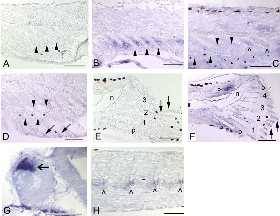 Fig. 5 Expression of bmp4 in the median fins and axial skeleton of zebrafish. Solid arrows mark fin rays, arrowheads mark radials, and hypurals are numbered. Black patches are melanophores. Anterior is to the left and dorsal to the top. A: In the same individual as H, bmp4 expression is not detected in the anal fin (5.4 mm). B: At a slightly later stage, bmp4 expression is observed in the interradial mesenchyme (5.7 mm). C: Expression of bmp4 is not detected in the ZS (*) between the proximal (top row of arrowheads) and distal (bottom row of arrowheads) radials, although it is maintained in the interradial mesenchyme (∧) between more posteriorly located, less-developed radials (6.0 mm). D: When radial segmentation is complete, expression of bmp4 is detected only in the fin rays (arrows; 6.6 mm). E: In the same individual as H, bmp4 expression is not detected in the caudal fin (5.4 mm). F: At a slightly later stage, expression is observed in the fin rays and ossifying perichondrium surrounding the hypurals, and very strongly in mesenchyme (hollow arrowhead) dorsal to the notochord (n) of the caudal fin (5.7 mm). G: An open arrow marks expression in the dorsal retina (Chin et al.,[1997]), which served as a positive control (26 hpf). H: Expression of bmp4 in the developing axial skeleton (centra, ∧) is not as robust as the dorsal retina positive control, but is clearly detectable (5.4 mm). Scale bars = 0.1 mm.