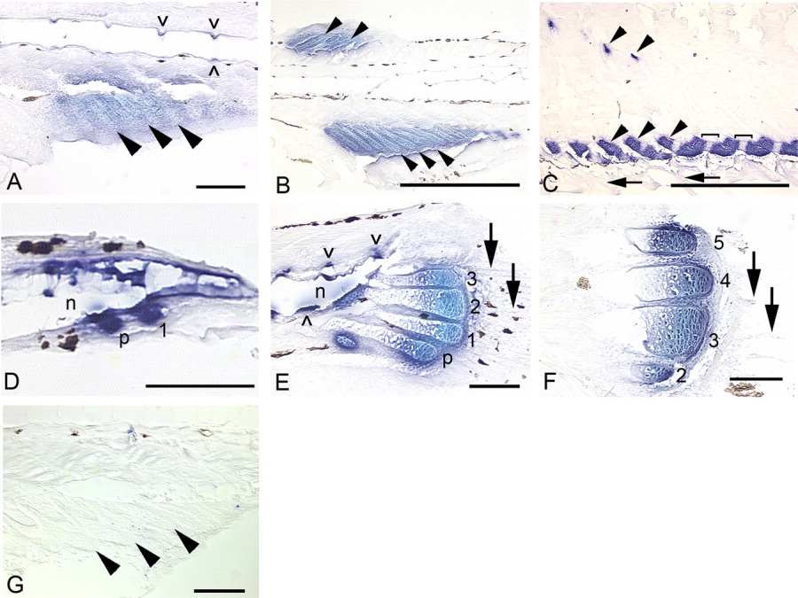 Fig. 11 Sagittal sections showing expression of the type II collagen gene in the median fins of zebrafish. In all panels, anterior is to the left and dorsal to the top. Black patches are melanophores. A: Early expression in the anal fin field (5.1 mm). Both prechondrogenic mesenchyme and radial chondrocytes (arrowheads) express type II collagen. B: Type II collagen is expressed throughout the fin field of both dorsal and anal fins (5.7 mm). Stain of mature chondrocytes in the radials is turquoise in color while interradial mesenchyme stains purple (this is loosely correlated to relative gene expression levels, with higher levels appearing as turquoise; R. Harland, personal communication). C: After radial segmentation is complete, type II collagen expression remains in the distal radials and the bands of cartilage that remain unossified in the distal portion of the proximal radials (arrowheads; 12.2 mm). This pattern is observed in the dorsal fin as well (data not shown). A few cells in the most proximal portion of the proximal radials (top arrowheads) also express type II collagen. D: Strong expression in mesenchymal condensations of the parhypural (p) and hypural one (1; 4.0 mm NL). E: Stain of mature chondrocytes in the hypurals is turquoise in color while inter-hypural mesenchyme stains purple (5.7 mm). A developing hemal arch expresses type II collagen as well (∧). Fin rays do not express the gene (arrows). F: Type II collagen expression becomes increasingly distally restricted as the hypurals continue to grow to adult size (11.3 mm). G: Sense probe does not exhibit any staining. Scale bars = 0.1 mm in A,D,G, 0.5 mm in B,C.