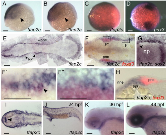 Fig. 1 Comparison of tfap2a and tfap2c expression at embryonic stages. (A, B) Lateral views, animal pole oriented up and dorsal side to the right, of panel A, tfap2c and panel B, tfap2a expression in ventral and lateral ectoderm at 6 hpf. Arrowheads point to the limit of expression, which is similar or identical for the genes. (C, D) Animal pole views of panel C, tfap2c and panel D, pax3 expression at 8.5 hpf. Expression of pax3 marks prospective neural crest (Lewis et al., 2004); tfap2c expression partially or entirely overlaps it. (E–G) Dorsal views of flat-mounted embryos at 11 hpf, anterior to the left. (E) tfap2c expression is detected in non-neural ectoderm (nne, asterisk), with increased levels immediately adjacent to the rostral neural plate, in the pre-placodal region (ppr, arrowheads). (F) Double RNA in situ hybridization with foxd3 (red) and tfap2c (blue) probes. More caudal cells expressing foxd3, which are recently specified pre-migratory neural crest cells (pnc), also express tfap2c (shown at higher magnification in panel F′, arrowhead indicates double-labeled cell). By contrast, at more rostral levels, tfap2c is expressed in ppr but is excluded from the majority of foxd3 expressing cells (shown at higher magnification in panel F″). (G) An embryo labeled with tfap2c and sox2, a pan-neural plate marker (Okuda et al., 2006). tfap2c expression is absent from cells immediately lateral to the neural plate, which is the pnc domain (arrowhead). (H) A transverse section of an embryo labeled as in panel F. tfap2c (blue) is expressed at high level in the ppr and nne, lateral to foxd3 expression (red) in pnc. (I–L) Dorsal and lateral views of embryos at the indicated ages processed to reveal tfap2c. (I) In the head, and panel J, trunk at 24 hpf, expression of tfap2c is detected in surface ectoderm and diencephalon (arrowhead). (K) At 36 hpf, tfap2c expression is reduced in surface ectoderm; (L) at 48 hpf, high level tfap2c expression is detected in the eye. Scale bars: (A–G, I–L), 100 μm; (F′–H), 50 μm.