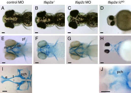 Fig. 3 tfap2a/c deficient embryos display non-additive defects in pigmentation and jaw morphology. (A–D) Dorsal views of live 72 hpf embryos. (A) Melanophores are abundant on the dorsal aspect of the head in a control-MO injected wild-type embryo, slightly reduced in panel B, a control MO-injected tfap2a mutant, normal in panel C, a tfap2c MO-injected wild-type embryo, but absent from panel D, a tfap2a-/cMO embryo (6 of 6 tfap2a-/cMO embryos). (E–H) Ventral views of 4 dpf embryos processed to reveal cartilage (alcian green), and bleached to remove pigment (except panel H). (E) Cartilages derived from mandibular (1st arch, m), hyoid (2nd arch, h), and ceratobranchial (3rd–7th arches, cb) arches are seen in a control embryo. Pectoral fin (pf) is also visible. (F) A control MO-injected tfap2a homozygous mutant embryo, with normal sized mandibular, but severely reduced hyoid and ceratobranchial cartilages, as previously reported (Schilling et al., 1996). (G) A tfap2c MO-injected wild-type embryo, in which all craniofacial cartilages appear normal. (H) A tfap2a-/cMO embryo, in which ventral craniofacial cartilage elements and pectoral fin are absent (10 of 10 tfap2a-/cMO embryos). (I) Ventral view of dissected neurocranium from a control embryo. (J) Ventral view of a tfap2a-/cMO embryo, shown at higher magnification, only the mesoderm-derived posterior neurocranium is visible (10 of 10 tfap2a-/cMO embryos). e, ethmoid plate; pch, parachordal; t, trabeculae cranii (Schilling et al., 1996). Scale bars: 100 μm.