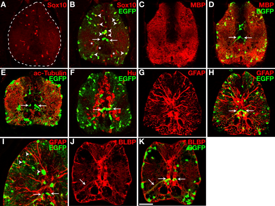 Fig. 2 olig2+ cells include radial glia and oligodendrocyte lineage cells in the postembryonic spinal cord. All images are single confocal optical sections of transverse sections of 30-dpf Tg(olig2:egfp) zebrafish spinal cords, dorsal up. Arrows indicate the soma and processes of EGFP+ radial cells. A,B: Anti-Sox10 labeling (A) and combined anti-Sox10 and EGFP images of same section (B). Most EGFP+ cells were Sox10+ oligodendrocyte lineage cells (arrowheads) except for EGFP+ radial glia. C,D: Anti-MBP antibody labeling (C) and combined MBP and EGFP images of same section (D). E,F: Laterally located EGFP+ cells were dispersed throughout large tracts of anti-acetylated Tubulin-positive axonal fibers (E), but there was no co-localization of EGFP and Hu (F). G-I: Anti-GFAP antibody labeling (G) and combined images of the same section for GFAP and EGFP (H, I). EGFP+ cell bodies were closely associated with GFAP+ processes but fluorescent signals for EGFP and GFAP did not appear to colocalize. J,K: Anti-BLBP antibody labeling (J) and combined images of the same section for BLBP and EGFP (K). Both the soma and processes of EGFP+ radial cells were BLBP+. Scale bar = 50 μM for all panels except I, for which it represents 100 μM.