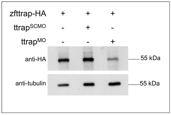 Fig. S1 Translational inhibition of Ttrap protein by Ttrap MO. Western blot analysis of HA-tagged zebrafish Ttrap, either alone (left lane), after co-injection with scrambled control MO (SCMO) (middle lane), or after co-injection with TtrapMO (1:1 mix of Ttrap MO1 and Ttrap MO2 (16 ng total), as used throughout this study) (right lane). Since none of the available antibodies against mammalian Ttrap were capable of detecting zebrafish Ttrap in vivo, we resorted to mRNA overexpresssion of full-length, HA-tagged zebrafish Ttrap (zfTtrap-HA) in fish embryos. Western blot analysis using an anti-HA antibody resulted in a single band of 55 kDa which is clearly downregulated in TtrapMO embryos. An anti-tubulin antibody was used to control for input and loading.