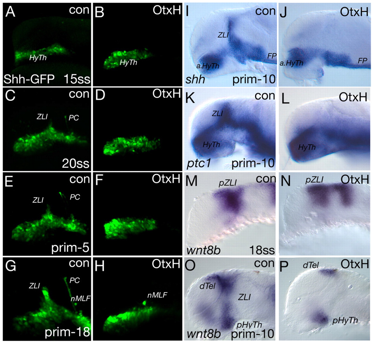 Fig. 3 Analysis of the ZLI in OtxH embryos. Confocal microscopy analysis of transgenic shh-GFP OtxH embryos and controls (con) (A-H) and gene expression analysis of OtxH embryos (I-P); the markers and stages are indicated. (A,B) Shh-GFP is detectable in the hypothalamic primordium (HyTh) in control embryos as well as in OtxH embryos at 17.5 hpf. (C-H) From 21 to 32 hpf, the ZLI develops from ventral to dorsal and the posterior commissure (PC) forms at the diencephalic-mesencephalic boundary in control embryos (C,E,G), whereas, in OtxH embryos, neither the ZLI nor the PC is detectable (D,F,H). Interestingly, the nucleus of the medio-longitudinal fascicle (nMLF) is visible in control embryos as well as in OtxH embryos (G,H). (I,J) At prim-10 (28 hpf), the Shh expression domains of the basal plate are unaltered in the anterior hypothalamus (aHyTh) and floor plate (FP) in OtxH embryos, whereas the ZLI, located in the alar plate, is missing compared with control embryos (42/51). (K,L) Similarly, the expression domain of ptc1 is absent at the ZLI in OtxH embryos (31/48). (M,N) Expression of the marker of the presumptive ZLI (pZLI), wnt8b, is unaltered in the diencephalic expression domain at 18 somites (18 hpf), although the MHB expression shifts anteriorly. (O,P) At prim-10, wnt8b is absent in the ZLI (10/12) but persists in the dorsal telencephalon (dTel) and posterior hypothalamus (pHyTh). prim, primordium stage; ZLI, zona limitans intrathalamica.