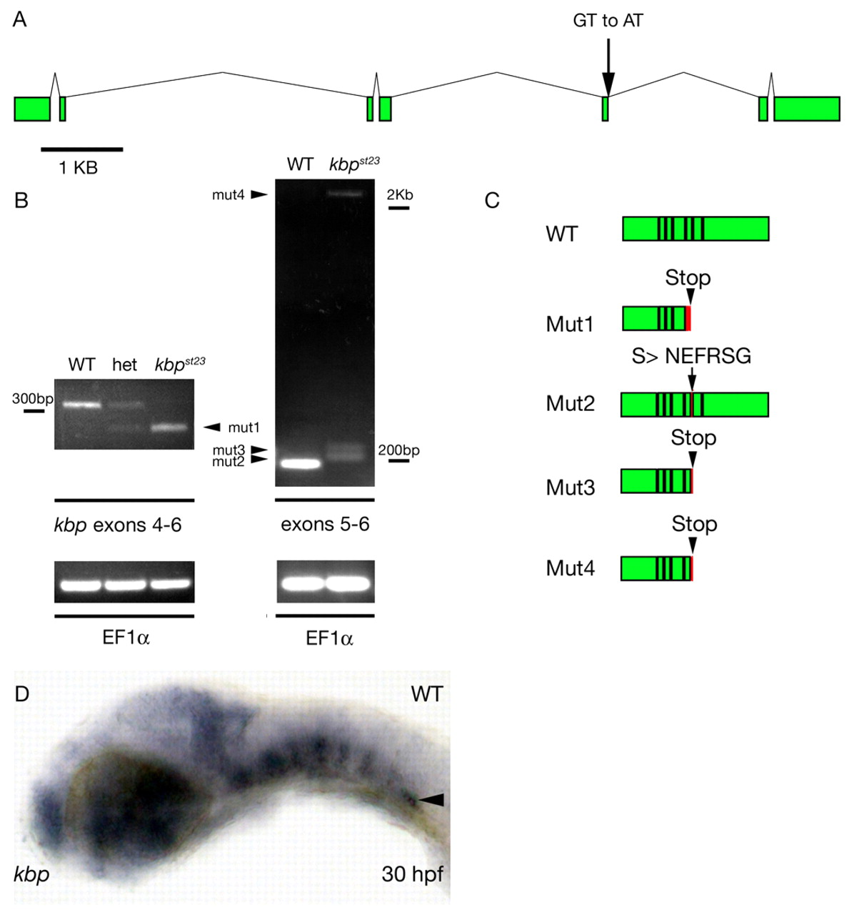 Fig. 2 The kbpst23 mutation disrupts the zebrafish kbp gene. (A) Genomic structure of zebrafish kbp. Green boxes indicate coding sequences of kbp exons. Scale bar is 1 kb. The splice donor disrupted by the st23 lesion is indicated by the arrow. (B) RT-PCR detects aberrant kbp transcripts in kbpst23 mutant larvae. Gel on left shows RT-PCR products generated with primers from exons 4 and 6 on RNA isolated from homozygous wild-type, heterozygous and kbpst23 mutant embryos. The lower mutant band, mut1 (arrowhead), reflects the deletion of exon 5 in the spliced mutant transcript. Gel on the right shows RT-PCR products generated with primers from exons 5 and 6 from RNA isolated from a mixture of larvae with wild-type phenotypes (i.e. homozygous wild type and heterozygous) and a group of kbpst23 mutant larvae. kbpst23 mutants have three weakly expressed transcripts (arrowheads) that result from aberrant splicing at the exon 5-6 junction. Below are loading controls showing that EF1α mRNA is robustly detected in all samples. (C) Schematic depicting the structure of the wild-type KBP protein and the abnormal products predicted to result from the four mutant kbp mRNAs. Red indicates regions encoded by intronic sequence and arrowheads indicate the positions of the premature stop codons predicted to truncate the proteins encoded by mutant mRNAs. Black lines separate coding sequences derived from different exons. (D) Lateral view of a wild-type embryo at 30 hpf showing kbp mRNA expression. Anterior is towards the left and dorsal is towards the top. The arrowhead indicates kbp expression in the posterior lateral line ganglion.
