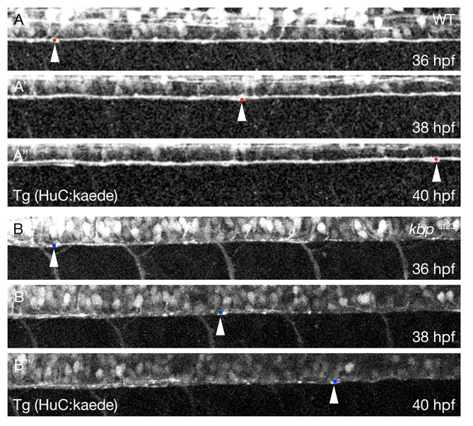 Fig. S1 KBP regulates the speed of axonal outgrowth in the CNS. (A-A″) Lateral views from a time-lapse series of the ventral spinal cord of a wild-type embryo with axons labeled by the Tg(HuC:kaede) transgene at 36 (A), 38 (A′) and 40 hpf (A″). Anterior is towards the left and dorsal is towards the top. The arrowheads and red dots indicate the posterior-most axons. (B-B″) Lateral views from a time-lapse series of the ventral spinal cord of a kbpst23 mutant embryo with axons labeled by the Tg(HuC:kaede) transgene at 36 (B), 38 (B′) and 40 hpf (B″). Anterior is towards the left and dorsal is towards the top. The arrowheads and blue dots indicate the posteriormost axons.