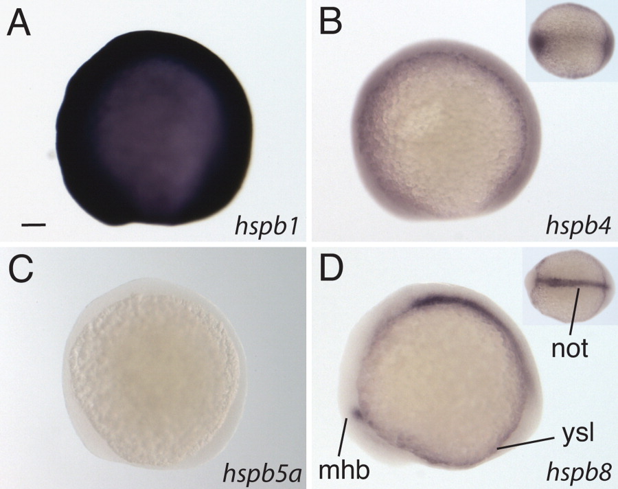 Fig. 1 Small heat shock protein (sHSP) mRNA expression in unstressed embryos at approximately 10 somites. A-D: Lateral views. B,D insets: Dorsal views. Anterior is to the left. A: hspb1 is expressed ubiquitously at high levels. B: hspb4 is expressed at low levels throughout the axis. C: hspb5a, which serves as a negative control, is not expressed. D: hspb8 is expressed in the mid-hindbrain boundary, notochord, and yolk syncytial layer. mhb, mid-hindbrain boundary; not, notochord; ysl, yolk syncytial layer. Scale bar = 100μm.