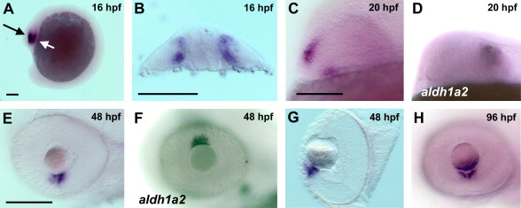 Fig. 2 Expression of aldh1a3 in the developing eye. Expression of aldh1a3 (A–C, E, G, H) and aldh1a2 (D and F) was detected by whole mount in situ hybridisation in the zebrafish eye. aldh1a3 was first detected in the eye primordium at 12–16 hpf (not shown; A, black arrow; B, transverse section through the plane indicated by the white arrow in A). While aldh1a3 is expressed in a divided domain adjacent to the optic stalk at 20 hpf (C), aldh1a2 is expressed in the temporal retina (D). From 36 hpf to 48 hpf aldh1a3 expression is visible in the retina ventral of the lens (E; G, transverse section through the eye). aldh1a2 is expressed in the retina dorsal to the lens at 48 hpf (F). At 96 hpf aldh1a3 remains expressed in two domains in the retina ventral of the lens (H). All figures show the embryos in a lateral view, anterior to the left, unless indicated otherwise. Scale bars, 100 μm.