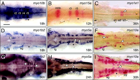 Fig. 3 Myosins exhibiting restricted expression patterns in the hindbrain. All panels show dorsal views of the hindbrain with anterior to the left. Asterisks mark the otic vesicle in each panel. (A and B) myo10b is expressed at varying levels in rhombomeres 2–5 (A), and myo15a is expressed in r3 and r5 (B), with both expressed at the midbrain–hindbrain boundary (mhb). (C) myo1e1 is weakly but specifically expressed in a mesendodermal domain spanning the 2nd and 3rd somites (arrowhead). (D and G) At 18 hpf, myo1b2 is expressed in sensory ganglia (tg, ag) and a cluster of cells in r2 (arrowhead, D). By 36 hpf (G), there is prominent expression in cells (arrowheads) at the boundaries of r5 and r6. (E and H) At 18 hpf, myo5a is expressed in sensory ganglia, and in differentiating neurons (arrowheads, E) within every rhombomere. By 24 hpf (H), expressing cells form a continuous column along the neural tube (arrowheads). (F and I) At 18 hpf, myo10a is expressed in the sensory ganglia (tg), and in the branchiomotor neurons in r2 and r5 (arrowheads, F). By 30 hpf (I), expression persists in the sensory ganglia and migrating motor neurons (arrowhead), and has expanded to large clusters of cells in the anterior hindbrain. tg, trigeminal ganglion; ag/pg, anterior and posterior lateral line ganglion. Scale bar, 75 μm.