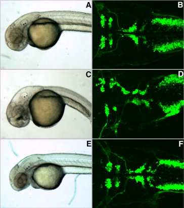 Fig. S1 Rescue of the lifr MO phenotype by co-injection of the lifr MO with lifr synthetic mRNA. Uninjected embryos exhibited no morphological defects (A) and developed normal cranial ganglia (B) at 48 hpf. In contrast, lifr MO injected embryos exhibited severe hydrocephaly (C) and possess several defects in branchiomotor neuron development (D) at 48 hpf. Co-injection of lifr MO with lifr mRNA rescued the lifr MO phenotype and resulted in ∼92% of embryos displaying a normal morphological phenotype (E), and ∼97% of embryos developing normal branchiomotor neurons (F).