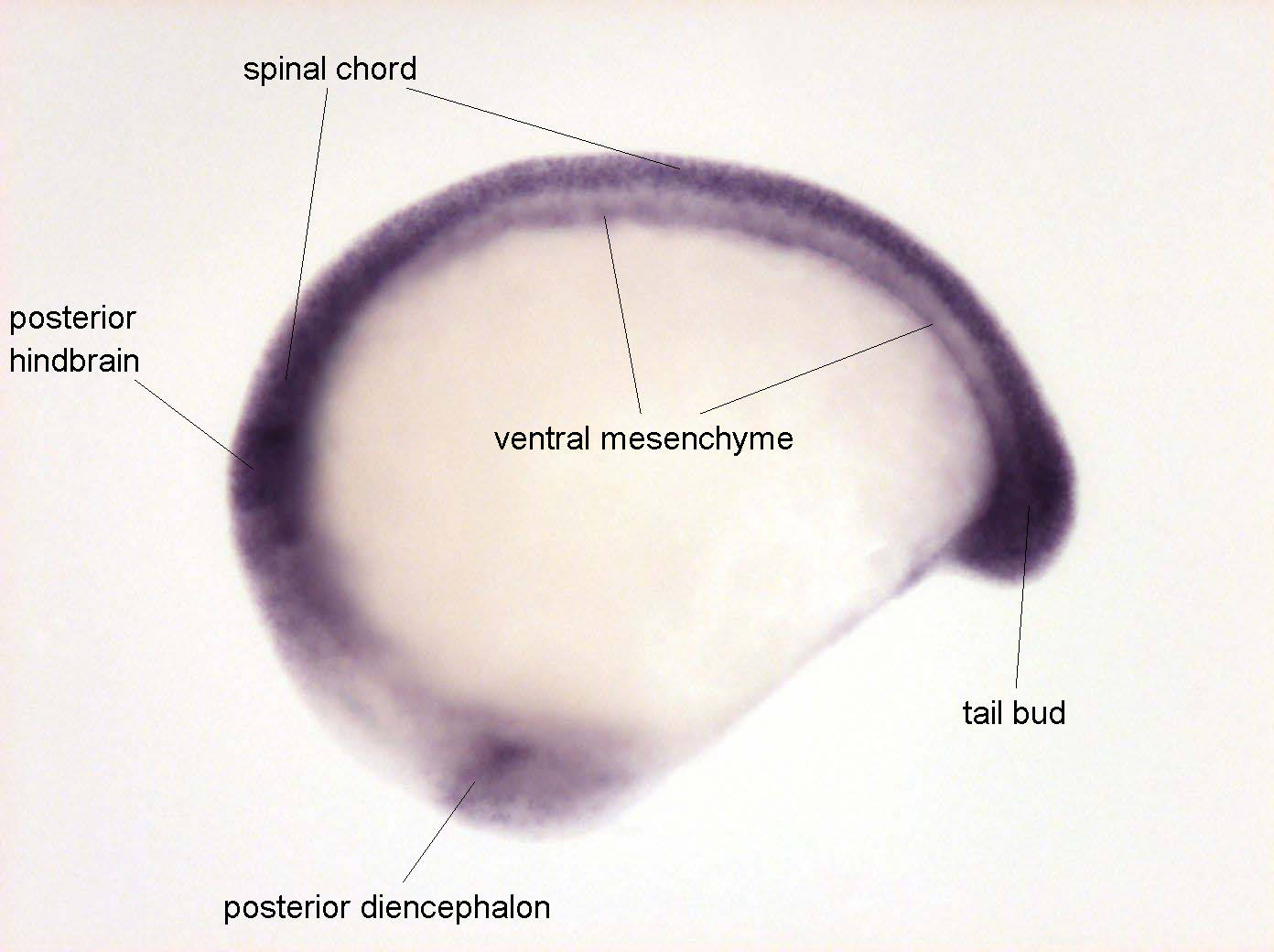 Fig. 3 Expressed in posterior diencephalon, in hindbrain (stronger in rhombomere 5 and 6), in spinal chord in tail bud and in ventral mesenchyme.